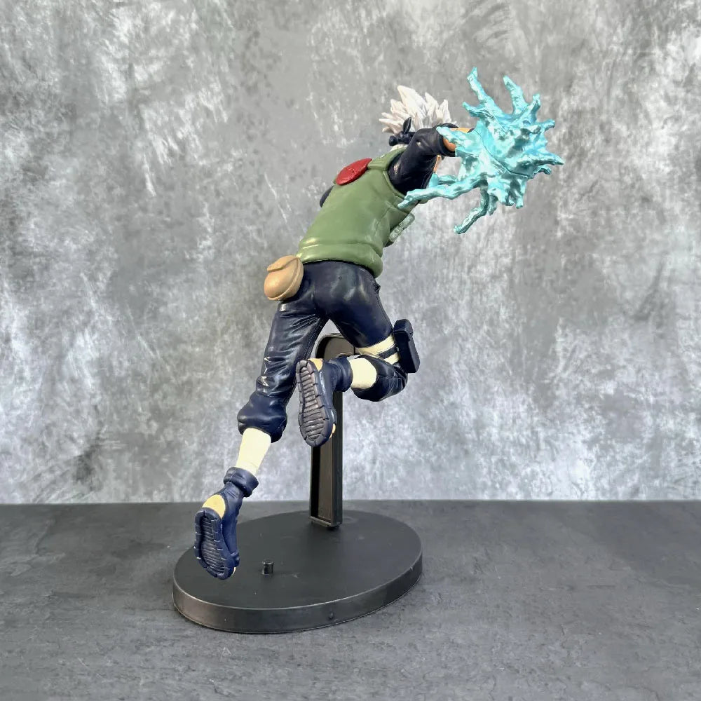 This highly detailed figure showcases Kakashi in his classic jonin attire, with a fierce combat expression and glowing blue chakra sculpted into an electrifying effect. Mounted on a floating stand to recreate the mid-air strike pose, it’s a true visual treat for any Naruto fan.